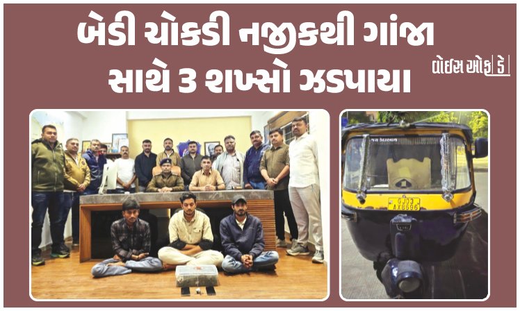 ગાંધીગ્રામ પોલીસ મથકના ઈન્ચાર્જ પીઆઈ એચ.એન.પટેલ, ઝોન-2 LCB PSI આર.એચ.ઝાલા તેમજ ટીમે બાતમીના આધારે માધાપર ચોકડીથી બેડી ચોકડી તરફ જતાં હાઈ-વે રોડ ઉપર મનહરપુરના મંદિરની સામે બાણધારી હોટેલ પાસેથી ઓટો રિક્ષા નં.GJ3AX-8696ને અટકાવી તલાશી લેતાં તેમાંથી પોણો કિલો ગાંજો મળી આવતા રિક્ષાચાલક અમનીશા યાસીનશા શાહમદાર (રહે.રેલનગર, મુળ વિસાવદર), અરમાન રાજુભાઈ ખોખર (રહે.ભગવતીપરા, મુળ બગસરા) અને મોહસીન અલારખાભાઈ શાહમદાર (રહે.ભગવતીપરા)ની ધરપકડ કરી હતી.