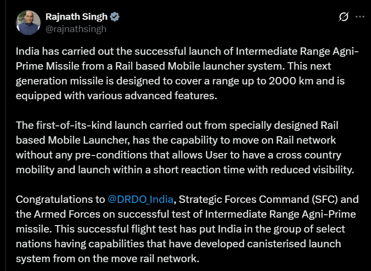 રાજનાથ સિંહની પોસ્ટમાં આગળ કહેવામાં આવ્યું છે કે, “આ મિસાઇલ અન્ય ઘણી મહત્વપૂર્ણ સુવિધાઓથી સજ્જ છે. તેને આજે ખાસ ડિઝાઇન કરાયેલ રેલ-આધારિત મોબાઇલ લોન્ચરથી લોન્ચ કરવામાં આવ્યું હતું. આ તેના પ્રકારનું પહેલું લોન્ચ છે, જે કોઈપણ પૂર્વશરતો વિના રેલ નેટવર્ક પર કાર્ય કરવા સક્ષમ છે.” આ સફળ ફ્લાઇટ પરીક્ષણે ભારતને એવા દેશોના પસંદગીના જૂથમાં સ્થાન આપ્યું છે જે મોબાઇલ રેલ નેટવર્કથી મિસાઇલ લોન્ચ કરવાની ક્ષમતા ધરાવે છે.