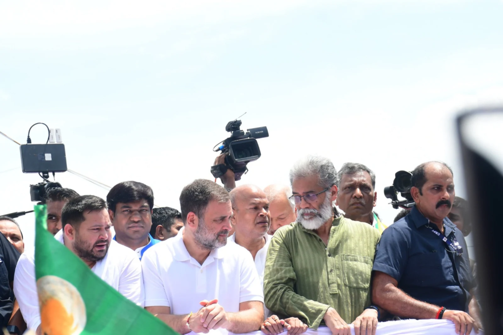 બિહારમાં વિધાનસભા ચૂંટણી 2025 પહેલા મતદાર યાદીના સ્પેશિયલ ઇન્ટેન્સિવ રિવિઝન (SIR) સામે મહાગઠબંધન દ્વારા બોલાવવામાં આવેલા ‘બિહાર બંધ’ વિરોધ પ્રદર્શનમાં RJD નેતા તેજસ્વી યાદવ, લોકસભાના વિપક્ષના નેતા અને કોંગ્રેસના સાંસદ રાહુલ ગાંધી, CPI મહાસચિવ ડી રાજા, ભારતીય કમ્યુનિસ્ટ પાર્ટી (માર્ક્સવાદી-લેનિનવાદી) લિબરેશનના નેતા દીપાંકર ભટ્ટાચાર્ય અને બિહાર કોંગ્રેસના પ્રમુખ રાજેશ રામ જોડાયા હતા.
