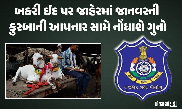 આગામી તા.7 જૂને રાજકોટ સહિત સમગ્ર દેશમાં બકરી ઈદ (ઈદ-ઉલ-અઝા)ના તહેવારની મુસ્લિમ બિરાદરો દ્વારા ઉજવણી કરવામાં આવનાર છે ત્યારે આ પર્વમાં કોઈ પ્રકારનો અનિચ્છનીય બનાવ ન બને તે માટે તકેદારીના ભાગરૂપે પોલીસ કમિશનર દ્વારા જાહેરનામું પ્રસિદ્ધ કરવામાં આવ્યું છે જેમાં જણાવ્યા પ્રમાણે જાહેરમાં જાનવરની કુરબાની આપનાર સામે ગુનો નોંધવામાં આવશે.