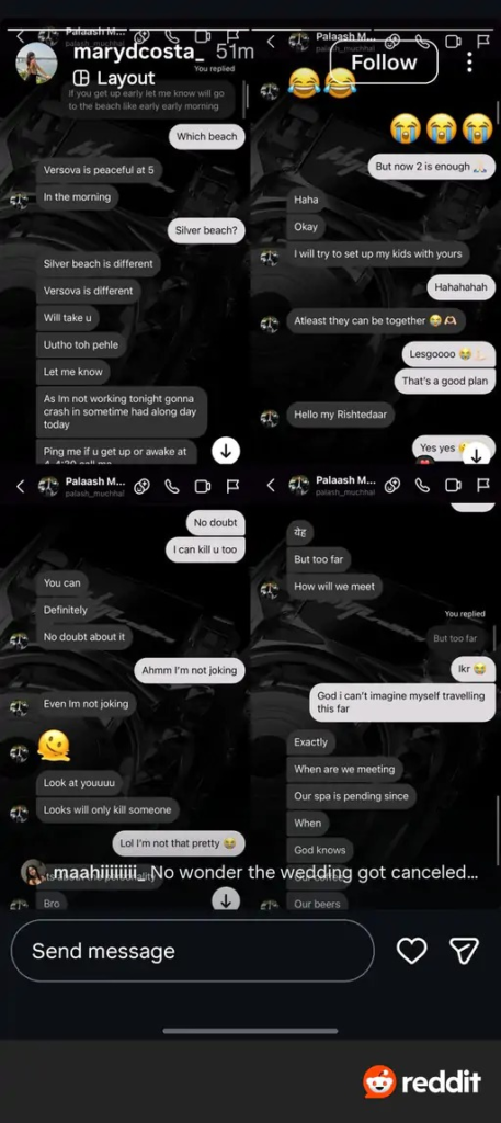 24 નવેમ્બરના રોજ, પલાશ મુચ્છલની બહેન પલક મુચ્છલે લગ્નગ્ર મુલતવી રાખવાની જાહેરાત કરી, અને તેના થોડા સમય પછી, પલાશના એક મહિલા સાથેના સ્ક્રીનશોટ રેડિટ પર વાયરલ થયા. આ કથિત રીતે પલાશ અને એક મહિલા વચ્ચે ફ્લર્ટી ચેટ્સ દર્શાવે છે. મેરી ડી’કોસ્ટા નામની એક મહિલાએ તેની ઇન્સ્ટાગ્રામ સ્ટોરી પર પલાશ સાથેની તેની ચેટ્સના કેટલાક સ્ક્રીનશોટ શેર કર્યા. આ ચેટ્સમાં, પલાશ સ્મૃતિ સાથેના તેના ‘લાંબા અંતરના’ સંબંધો અને તેમના ‘પ્રવાસો’ વિશે ચર્ચા કરતો જોવા મળ્યો. તેણે મેરીની ખૂબ પ્રશંસા કરી, તેને સ્વિમિગ, સ્પા અને સવારે ૫ વાગ્યે મુંબઈના વર્સોવા બીચ પર મળવાનું આમંત્રણ આપ્યું. જ્યારે મેરીએ સીધું પૂછ્યું કે શું તે સ્મૃતિ મંધાનાને પ્રેમ કરે છે, ત્યારે પલાશે પ્રશ્ન ટાળી દીધો. કેટલાક યુઝર્સ એવો પણ દાવો કરી રહ્યા છે કે લગ્ન સમારંભ દરમિયાન પલાશનું કોરિયોગ્રાફર સાથે અફેર હતું, જે રદ થવાનું વાસ્તવિક કારણ હોઈ શકે છે.