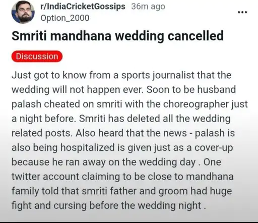 આ મામલે સૌથી ચોંકાવનારી વાત એ છે કે સોશિયલ મીડિયા પર આ હોબાળો થતાં જ સ્મૃતિ મંધાનાએ તેના ઇન્સ્ટાગ્રામ એકાઉન્ટ પરથી તેની અને પલાશની સગાઈ સંબંધિત બધી પોસ્ટ ડિલીટ કરી દીધી. તાજેતરમાં જ પલાશે સ્ટેડિયમમાં ઘૂંટણિયે પડીને ફિલ્મી શૈલીમાં સ્મૃતિને પ્રપોઝ કર્યું હતું, જેનો વીડિયો વાયરલ થયો હતો. તે બધી પોસ્ટ્સ હટાવવાથી ચાહકોની ચિતા વધી રહી છે. પલાશને સોશિયલ મીડિયા પર ટ્રોલ કરવામાં આવી રહી છે, જ્યારે ઘણા યુઝર્સ સ્મૃતિને સમર્થન આપી રહ્યા છે, એમ કહીને કે, “સ્મૃતિ એક મજબૂત મહિલા છે જેણે વર્લ્ડ કપ જીત્યો હતો, પરંતુ આ વિશ્વાસઘાત સહન કરવો મુશ્કેલ હશે.”