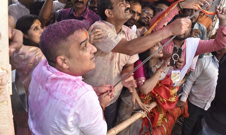 અંબાજીમાં પોલીસ સાથે ગૃહ મંત્રી હર્ષ સંઘવીએ ધજા ચડાવી