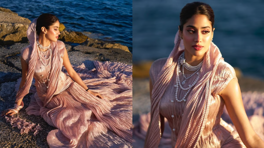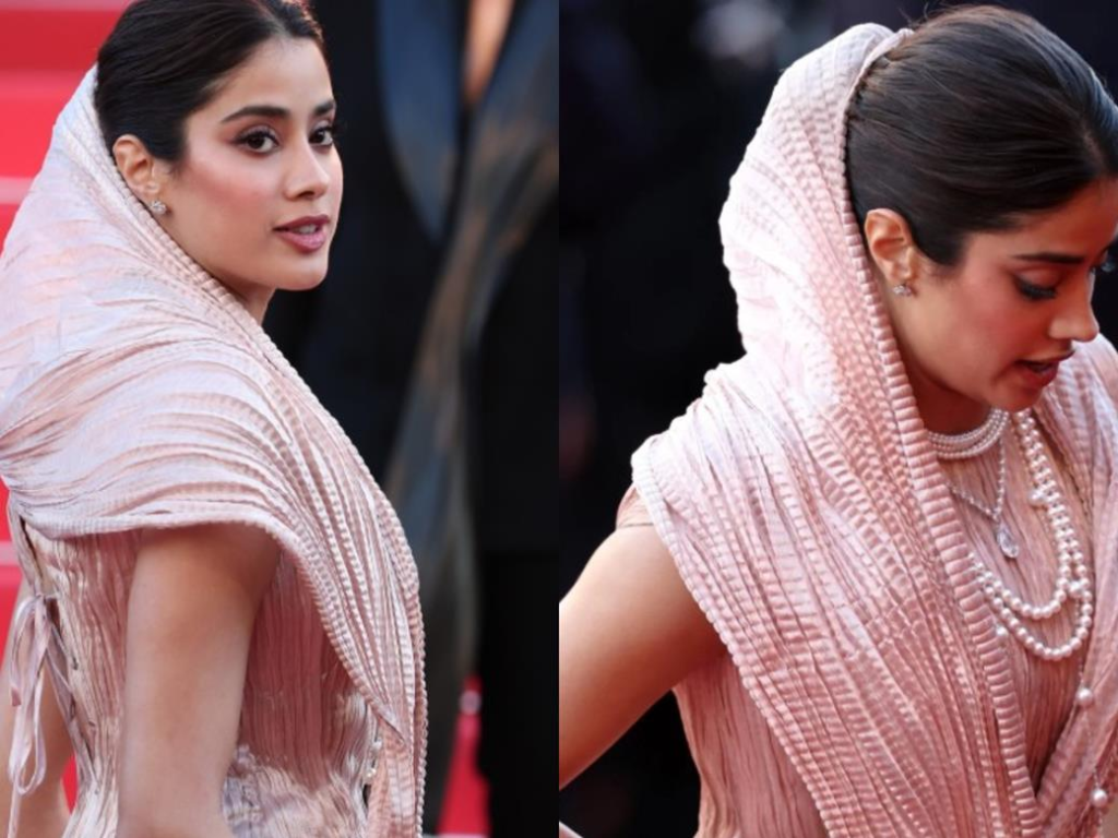 જાહ્નવી કપૂરે કાન્સ ફિલ્મ ફેસ્ટિવલના રેડ કાર્પેટ પર તરુણ તાહિલિયાની દ્વારા બનાવેલ કસ્ટમાઇઝ્ડ ગાઉન પહેરીને એન્ટ્રી કરી. આ ગાઉનની ખાસ વાત એ હતી કે તે બિલકુલ સાડી જેવો દેખાતો હતો, પણ તે એક સ્કલ્પટેડ ડ્રેસ હતો. આ સોફ્ટ પિંક રંગના ગાઉનનો ઉપરનો ભાગ ફીટેડ કોર્સેટ હતો અને નીચેના ભાગમાં લાંબો ટ્રેઇલ સ્કર્ટ હતો. જ્હાન્વીનો આખો ગાઉન પ્લીટેડ પેટર્નનો હતો