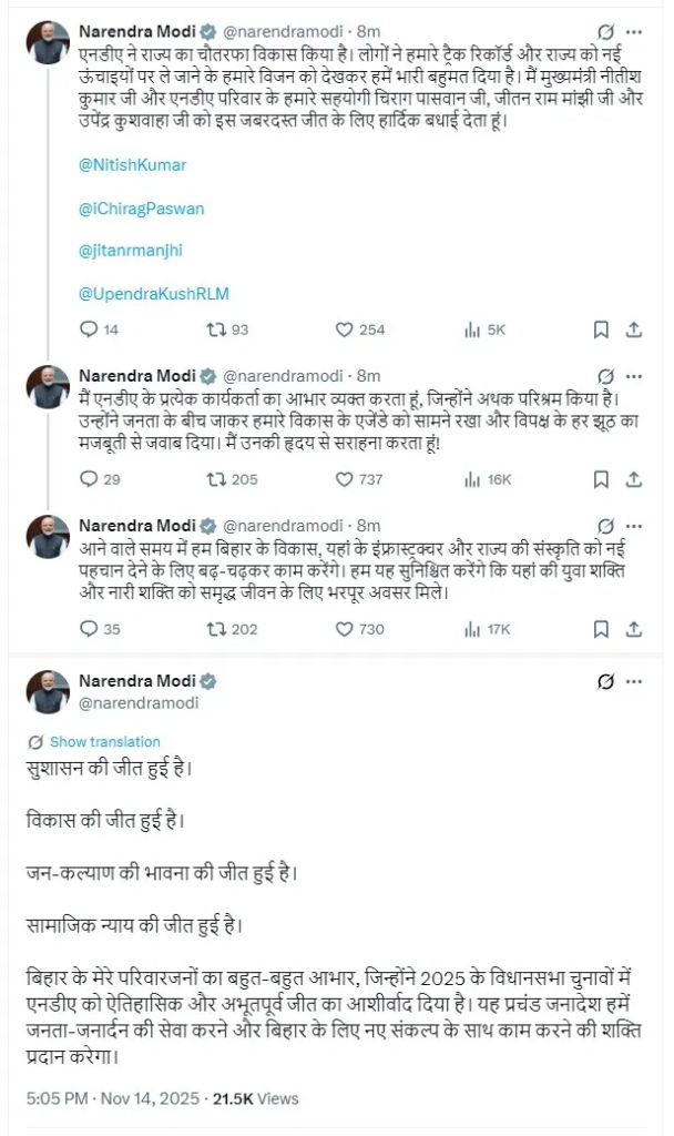 તેમના X હેન્ડલ પર શ્રેણીબદ્ધ પોસ્ટ્સમાં, પ્રધાનમંત્રીએ લખ્યું, “હું દરેક NDA કાર્યકર્તાનો આભાર માનું છું જેમણે અથાક મહેનત કરી છે. તેઓ જનતા સમક્ષ ગયા છે, અમારા વિકાસ એજન્ડા રજૂ કર્યા છે અને વિપક્ષના દરેક જુઠ્ઠાણાનો મજબૂતીથી જવાબ દીધો. હું તેમની ખૂબ પ્રશંસા કરું છું!”