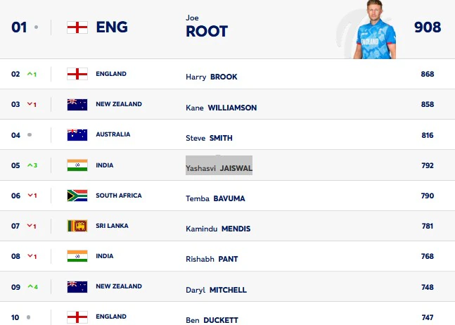 બેટ્સમેનોમાં, ભારતીય ઓપનર યશસ્વી જયસ્વાલ ઓવલ ટેસ્ટમાં સદી ફટકારીને ટોચના પાંચમાં ફરી પ્રવેશ કર્યો છે. યશસ્વી ત્રણ સ્થાનના સુધારા સાથે પાંચમા સ્થાને પહોંચી ગયો છે.ઓવલ સેન્ચુરિયન યશસ્વી જયસ્વાલ 792 રેટિંગ પોઈન્ટ સાથે ત્રણ સ્થાન ઉપર આવી ગયા છે, જ્યારે રમતના અન્ય સેન્ચુરિયન જો રૂટ અને હેરી બ્રુક ICC મેન્સ ટેસ્ટ બેટ્સમેન રેન્કિંગમાં પ્રથમ બે સ્થાન પર મજબૂત રીતે યથાવત છે. કેન વિલિયમસન ત્રીજા નંબરે છે અને સ્ટીવ સ્મિથ ચોથા ક્રમે છે. ભારતીય કેપ્ટન શુભમન ગિલ ટોપ 10માંથી બહાર થઈ ગયો છે. તે હવે 13મા ક્રમે આવી ગયો છે.