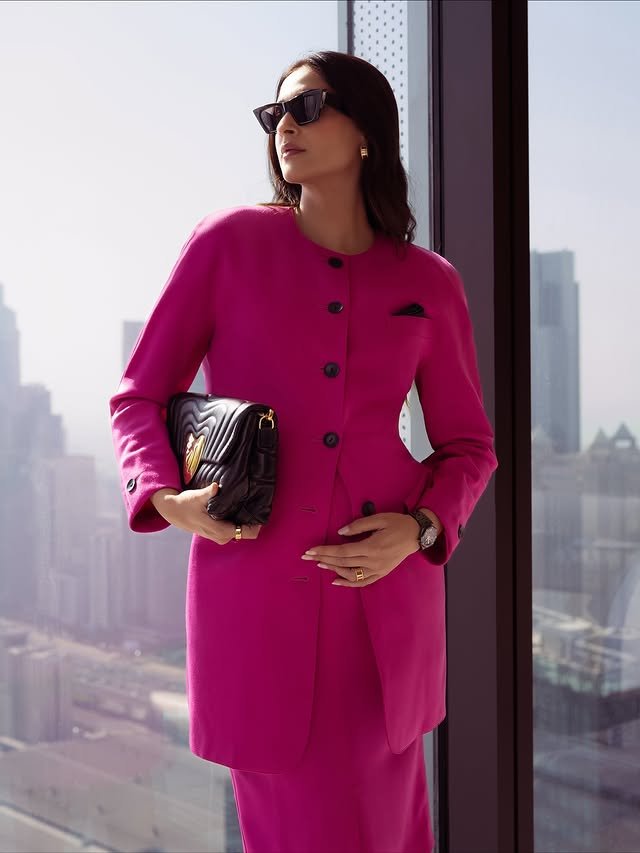 સોનમે ઔપચારિક છતાં ફેશનેબલ ગુલાબી પોશાકમાં ઘણા ફોટા પોસ્ટ કર્યા. તેણે પેન્સિલ-કટ સ્કર્ટ સાથે બ્લેઝર પહેર્યું, તેને મેચિંગ હેન્ડબેગ અને કાળા શેડ્સ સાથે જોડી દીધું.સોનમે તેના બેબી બમ્પ પર હાથ મૂકીને તેની ગર્ભાવસ્થાનો સંકેત આપ્યો. તેણે કેપ્શનમાં ફક્ત “MOTHER ” લખ્યું ઇમોજી પોસ્ટ કર્યું છે.