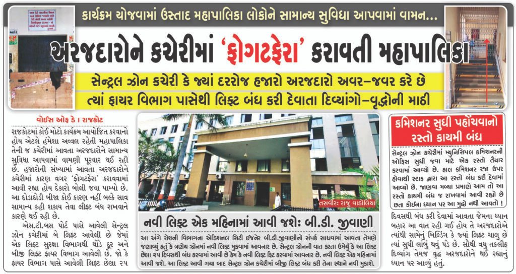 અરજદારોના ‘ફોગટફેરા’ બંધ થશે: રાજકોટ મનપામાં લિફ્ટનું કામ શર,’વોઇસ ઓફ ડે’દ્વારા પ્રસિધ્ધ થયેલા અહેવાલ બાદ તંત્રની આંખ ખુલી