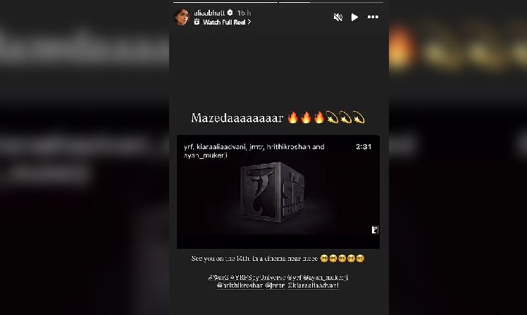 અભિનેત્રી આલિયા ભટ્ટે તેના ઇન્સ્ટાગ્રામ પર એક સ્ટોરી શેર કરી છે, જેમાં તેણીએ આગામી ફિલ્મ ‘વોર 2′ નું ટ્રેલર શેર કર્યું છે. સ્ટોરીના કેપ્શનમાં, અભિનેત્રીએ લખ્યું છે, ”War 2′, See you on the 14th, in a cinema near meee.’ આ કેપ્શનમાં, આલિયાએ મુખ્ય કલાકારો ઋત્વિક રોશન, જુનિયર એનટીઆર, કિયારા અડવાણી અને દિગ્દર્શક અયાન મુખર્જીને પણ ટેગ કર્યા છે. અભિનેત્રીના કેપ્શનમાં સૂચવવામાં આવ્યું છે કે આલિયા ભટ્ટ ‘વોર 2’ ના પોસ્ટ ક્રેડિટ દ્રશ્યમાં કેમિયો તરીકે જોવા મળશે, જે તેની આગામી જાસૂસી ફિલ્મ ‘આલ્ફા’ ની ઝલક હશે.