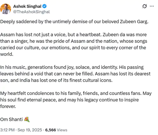 ભૂતપૂર્વ રાજ્યસભા સાંસદ રિપુ બોરાએ ઇન્સ્ટાગ્રામ પર ગાયકને અંતિમ શ્રદ્ધાંજલિ આપી. તેમણે લખ્યું, “આપણા સાંસ્કૃતિક પ્રતિષ્ઠા ઝુબીન ગર્ગના અકાળ અવસાનથી ખૂબ જ આઘાત અને દુઃખ થયું. તેમના અવાજ, સંગીત અને હિંમતે આસામ અને તેનાથી આગળની પેઢીઓને પ્રેરણા આપી. તેમના પરિવાર, ચાહકો અને પ્રિયજનો પ્રત્યે મારી હૃદયપૂર્વકની સંવેદના. શ્રદ્ધાંજલિ.”