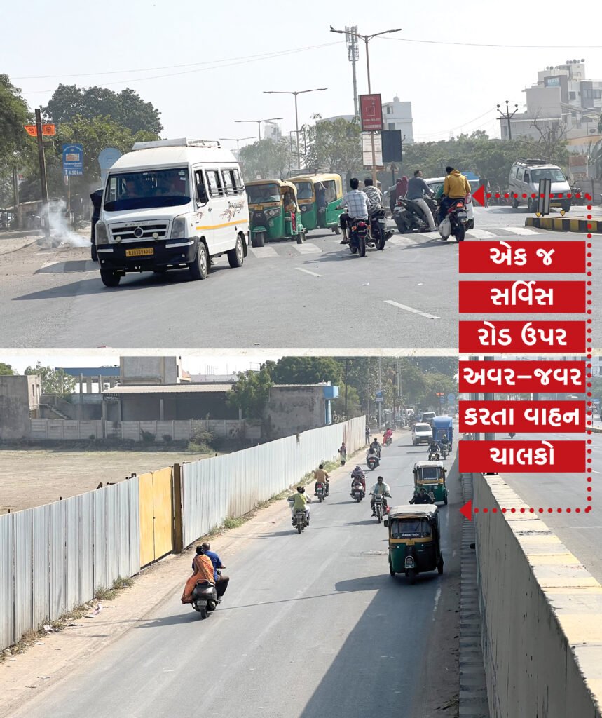 રાજકોટમા માધાપર ચોકડી કરોડો રૂપિયાના ખર્ચે બ્રિજ બન્યો પરતુ સાઢિયા પુલ, સિવિલ હોસ્પિટલથી માધાપર તરફ જવાના રસ્તા પર એક બાજુનો સર્વિસ રોડ ચાલુ ન કરતા હોસ્પિટલ તરફથી મોરબી રોડ તરફ જવા માટે વાહનચાલકોને રોંગ સાઇડમા જવુ પડે છે. અહી સવારના સમયે તેમજ સાજના સમયે ટ્રાફિક સમસ્યા સર્જાય છે. નોંધનીય છે કે, જમીન સપાદન મામલે સર્વિસ રોડનો પ્રશ્ન અટવાયેલો રહ્યો હતો જો કે તત્ર દ્વારા જમીન સપાદન અને વળતરની કાર્યવાહી હાથ ધરવામા આવી છે પરતુ હાલ તો લોકોને મુશ્કેલીનો ભોગ બનવુ પડી રહ્યુ છે.