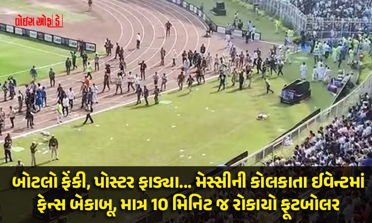 કોલકાતામાં ફૂટબોલર લિયોનેલ મેસ્સીના GOAT ટૂરમાં અફરાતફરી ફેલાઈ હતી. અવ્યવસ્થાને કારણે ગુસ્સે ભરાયેલા ચાહકોએ પોસ્ટરો તોડ્યા અને બોટલો ફેંકી. પરિસ્થિતિ વધુ વણસી જતાં સુરક્ષા દળો દ્વારા મેસ્સીને માત્ર 10 મિનિટમાં જ સ્ટેડિયમની બહાર લઈ જવામાં આવ્યો, જેના કારણે હજારો ચાહકો પરેશાન થયા.