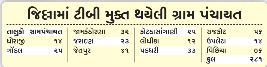 રાજકોટ જિલ્લા પંચાયતના આરોગ્ય વિભાગના સત્તાવાર સૂત્રોના જણાવ્યા મુજબ 100 દિવસની સઘન ટીબી નિર્મૂલન ઝુંબેશ બાદ જિલ્લામાં ઓક્ટોબર 2025 સુધીમાં કુલ 1,49,257 લોકોનું ટીબી સ્ક્રીનિંગ કરવામાં આવતા અત્યાર સુધીમાં કુલ 2182 ટીબીના નવા દર્દીઓ મળી આવ્યા હતા. જે પૈકી રાજકોટ જિલ્લાના 1673 દર્દીઓને હાલમાં ટીબી રોગને હરાવવા માટે નિયમિત રીતે દવા લઇ રહ્યા છે. નોંધનીય છે કે, ટીબીના દર્દીઓને ગુજરાત સરકાર અને જિલ્લા પંચાયતના સ્વ ભંડોળમાંથી દર મહિને 1000 રૂપિયા સહાય સીધી જ બેન્ક ખાતામાં જમા કરવામાં આવે છે.હાલમાં જિલ્લામાં 1498 ટીબીના દર્દીઓને નિક્ષય પોષણ સહાય યોજનાનો લાભ આપવામાં આવી રહ્યો છે અને ઓક્ટોબર અંત સુધીમાં આ દર્દીઓના ખાતામાં કુલ રૂપિયા 76.56 લાખ જમા કરાવવામાં આવ્યા છે.