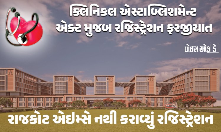રાજ્યમાં ગુજરાત ક્લિનિકલ એસ્ટાબ્લિશમેન્ટ એક્ટ મુજબ રજિસ્ટ્રેશન ફરજીયાત છે ત્યારે ગુજરાતની એક માત્ર એઇમ્સ હોસ્પિટલનું ક્લિનિકલ એસ્ટાબ્લિશમેન્ટ એક્ટ અન્વયે રજિસ્ટ્રેશન થયું ન હોવાનું રજિસ્ટ્રેશન વેબ સાઈટ પરથી સામે આવ્યું છે. રાજકોટ એઇમ્સના બિલ્ડીંગનું કામ હજુ પ્રગતિમાં હોય કમ્પ્લીશન સર્ટિફિકેટ વગર સંપૂર્ણ ફાયર એનઓસી મળેલું ન હોવાના કારણે રજિસ્ટ્રેશન ન થયું હોવાનું મનાઈ રહ્યું છે. હાલમાં તમામ તબીબો, હોસ્પિટલ અને સંસ્થાને પ્રોવિઝનલ રજિસ્ટ્રેશન ગુજરાત ક્લિનિકલ એસ્ટાબ્લિશમેન્ટ એક્ટ અન્વયે રજિસ્ટ્રેશન માટે અવાર નવાર મુદતમાં વધારો કરવામાં આવ્યો છે અને આગામી એપ્રિલ માસ સુધીની મુદત વધી છે ત્યારે કાયદાના અમલ બાદ હાલમાં રજિસ્ટ્રેશન કરાવનાર તમામ હોસ્પિટલ, સંસ્થા, તબીબો અને લેબોરેટરીને એક વર્ષની મુદત માટે જ પ્રોવિઝનલ રજિસ્ટ્રેશન કરવામાં આવ્યા હોવાનું સતાવાર સૂત્રો જણાવી રહ્યા છે.