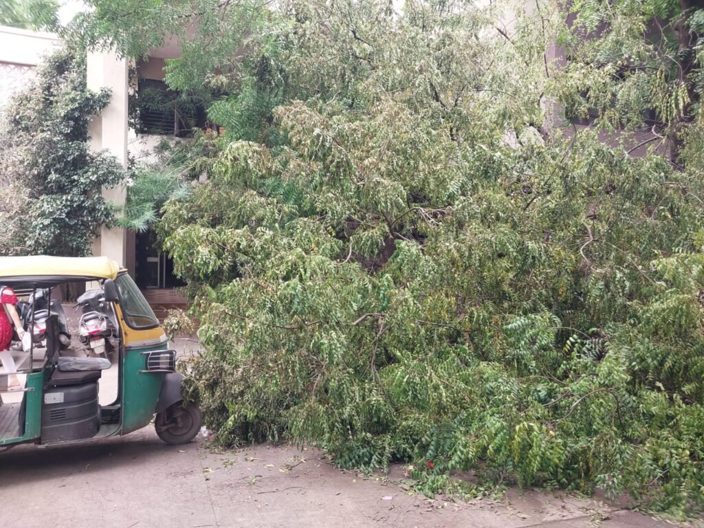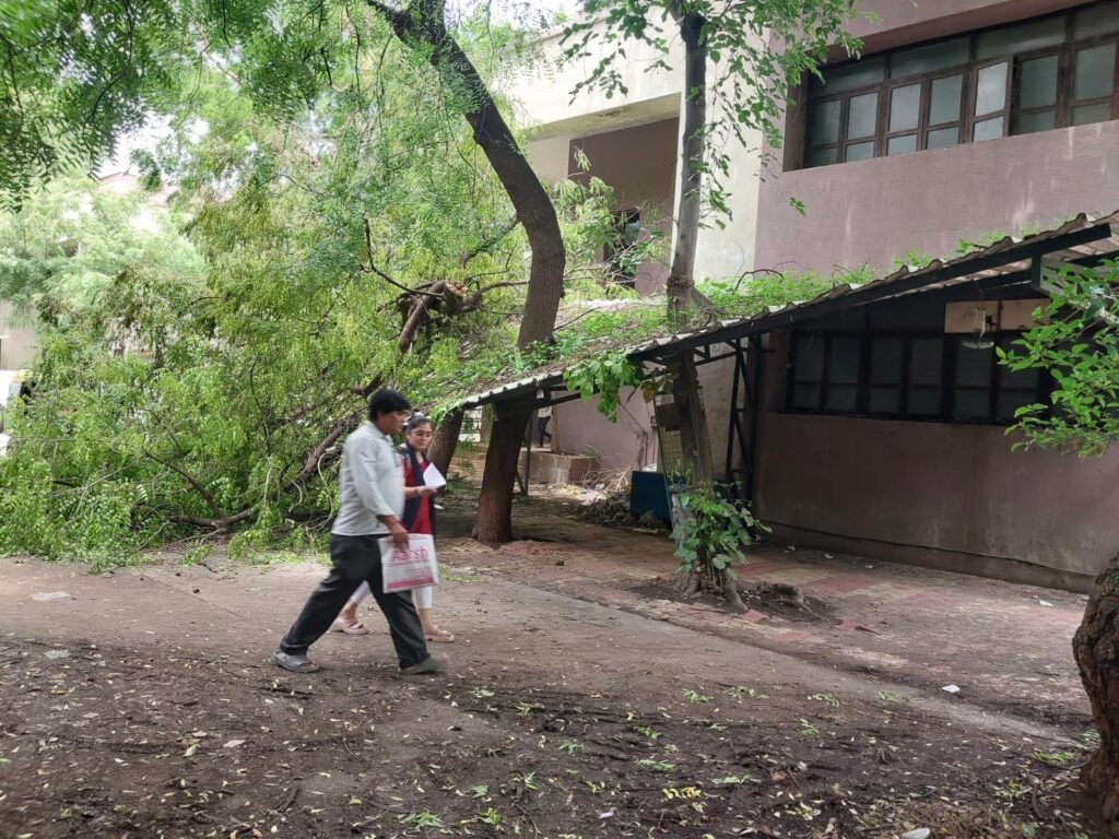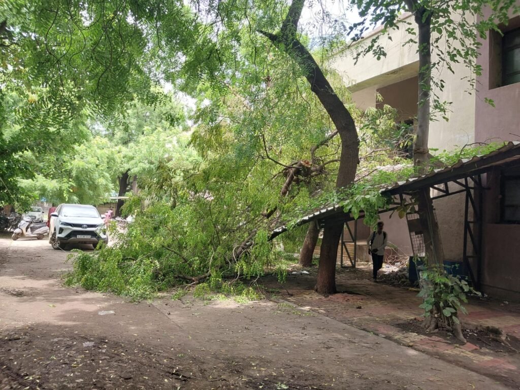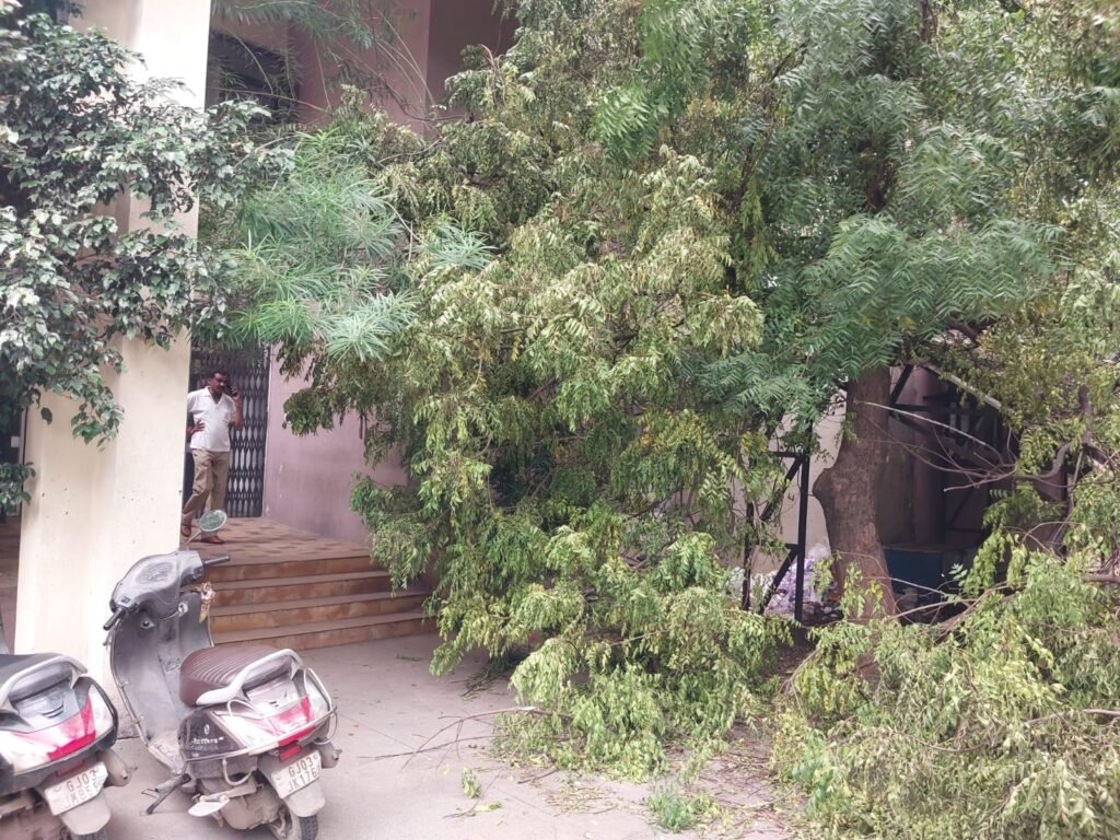 રાજકોટ તાલુકા મામલતદાર કચેરીનો પુરવઠા વિભાગ અને એટીવીટી સેન્ટર જ્યાં બેસે છે તે ન્યાય મંદિરમાં છેલ્લા ત્રણ દિવસથી લીમડાનું વૃક્ષ ધરાશયી થતા અહીં આવતા અરજદારોને હાલાકીનો ભોગ બનવું પડી રહ્યું હોવાનું અને કચેરીમાં પ્રવેશવા જંગલ જેવી સફર કરવી પડતી હોવાનું સામે આવ્યું છે. ચોંકાવનારી બાબત તો એ છે કે, વૃક્ષ ધરાશયી થવાથી અહીં જીવતા વીજ વાયર લટકી રહ્યા હોવા છતાં તંત્ર દ્વારા આ જોખમી વીજ વાયર દૂર કરાવવા તસ્દી લેવામાં નથી આવી.