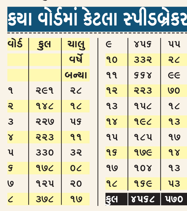 મહાપાલિકા દ્વારા આ વર્ષમાં કુલ 570 સ્પીડબ્રેકર બનાવવામાં આવ્યા છે પરંતુ તે પણ ઢંગધડા વગરના જ હોવાથી સ્પીડબ્રેકરનો સાચો હેતુ સાર્થક થઈ રહ્યો નથી. સ્પીડબ્રેકરપૂરપાટ ઝડપે આવતા વાહનને ધીમું પાડવા માટે હોય છે પરંતુ મહાકાય સ્પીડબ્રેકરને કારણે કારના જમ્પર સ્પીડબ્રેકર સાથે અથડાઈ પડે છે તો અમુક ટુ-વ્હીલર તો રીતસરના ઉલળી જતાં હોવાનું પણ અનેકવાર બન્યું છે.