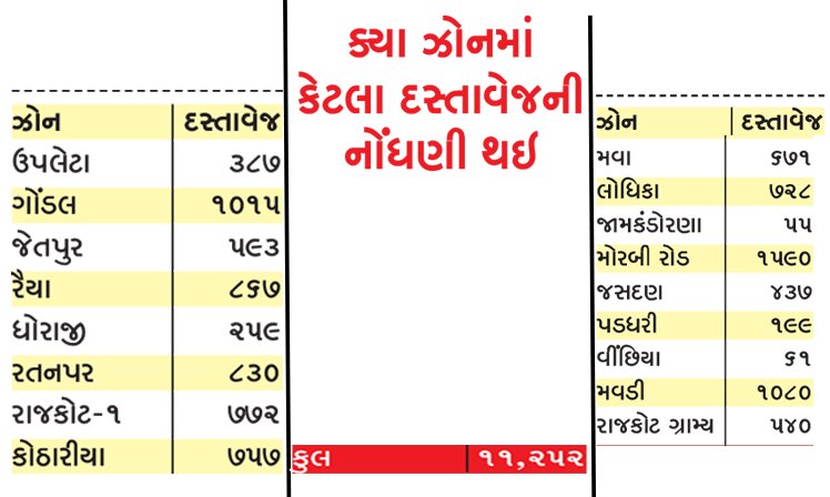 રાજકોટ નોંધણી સર નિરીક્ષકની કચેરીના સત્તાવાર આંકડા મુજબ રાજકોટ શહેર – જિલ્લામાં ઓગસ્ટ માસ દરમિયાન જમીન, મકાન, દુકાન, ઓફિસ, મોર્ગેજ, લગ્ન વિચ્છેદ, ભાગીદારી ડીડ સહિતના કુલ 11,252 દસ્તાવેજની નોંધણી થઇ હતી. જેમાં સૌથી વધુ દસ્તાવેજ નોંધણી રાજકોટના મોરબી રોડ ઝોનમાં 1590 તેમજ મવડી ઝોનમાં 1590 દસ્તાવેજની નોંધણી થઇ હતી. રાજકોટ ગ્રામ્યમાં સૌથી વધુ દસ્તાવેજની નોંધણી ગોંડલ સબરજિસ્ટ્રાર કચેરીમાં 1015 અને લોધીકા સબ રજિસ્ટ્રાર કચેરીમાં 728 દસ્તાવેજની નોંધણી થઇ હતી.નોંધનીય છે કે, રાજ્ય સરકારને ઓગસ્ટ મહિનામાં 558451457 સ્ટેમ્પ ડયુટીની રૂ.55,84,51,457 અને નોંધણી ફીની આવક રૂ. 9,15,42,757 મળી કુલ 64,99,94,214ની આવક થઈ હતી.