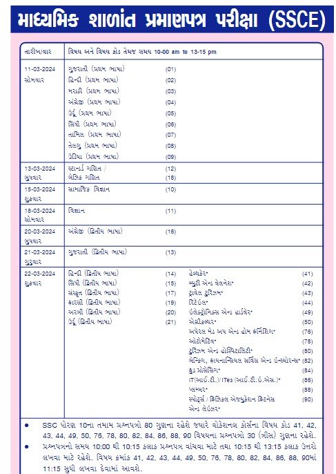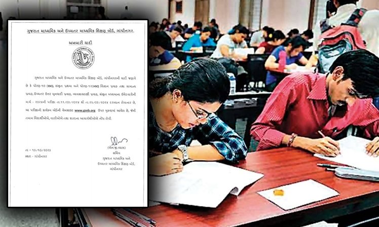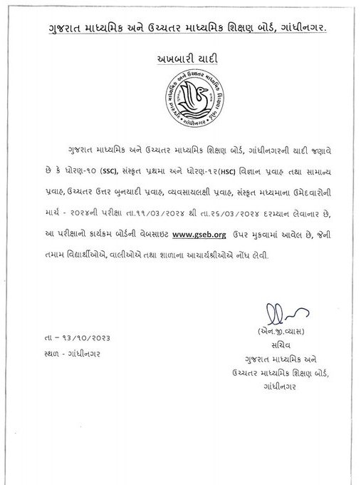 ગુજરાત માધ્યમિક અને ઉચ્ચતર માધ્યમિક શિક્ષણ બોર્ડાન સચિવ એન.જી વ્યાસ દ્વારા જાહેર કરવામાં આવેલ અખબારી યાદીમાં જણાવવામાં આવ્યું છે કે. ધોરણ 10 (SSC), સંસ્કૃત પ્રથમા અને ધોરણ 12 (HSC) વિજ્ઞાન પ્રવાહ તથા સામાન્ય પ્રવાહ, ઉચ્ચતર ઉત્તર બુનયાદી પ્રવાહ, વ્યવસાયલક્ષી પ્રવાહ, સંસ્કૃત માધ્યમના ઉમેદવારોની માર્ચ- 2024ની પરીક્ષા તારીખ 11/03/2024થી તારીખ 26/03/2023 દરમિયાન લેવામાં આવશે.