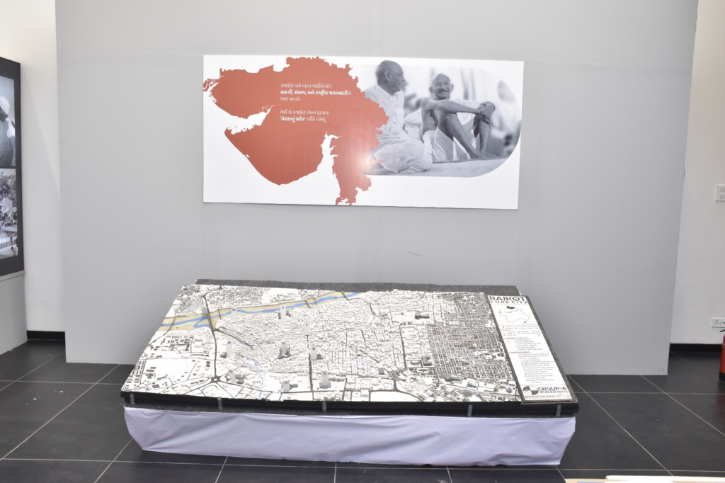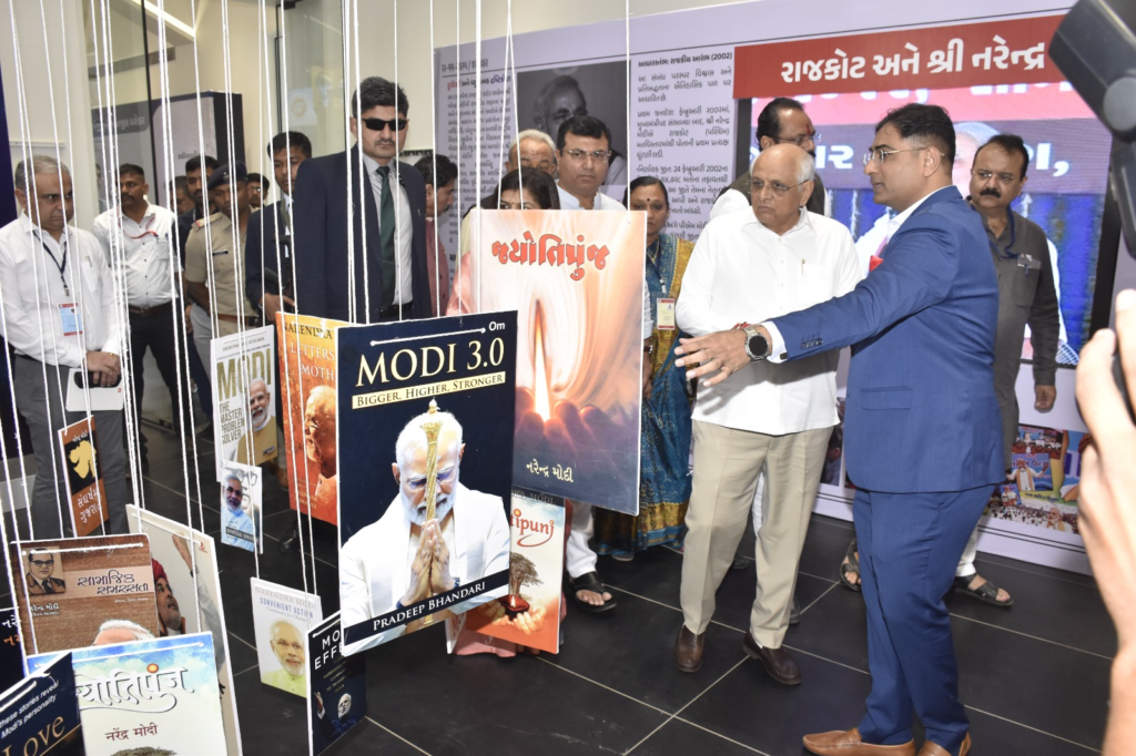 આ વેળાએ મુખ્યમંત્રીએ “રાઈઝિંગ રાજકોટ”ની થીમ હેઠળ રાજકોટ શહેરના 20 વર્ષના વિકાસની તસવીરી ઝલક સાથે વડાપ્રધાન નરેન્દ્રભાઈ મોદીના રાજકોટ સાથેના સંસ્મરણો, કલા અને સાહિત્ય ક્ષેત્રે રાજકોટનું અનેરું પ્રદાન, પાણીના સ્વાવલંબન ક્ષેત્રે કરેલી જળક્રાંતિ, ઉદ્યોગ જગતમાં રાજકોટનો અમૂલ્ય ફાળો દર્શાવતા ઔદ્યોગિક એકમોની મશીનરીના વર્કિંગ મોડલ, વડાપ્રધાન દ્વારા લિખિત પુસ્તકોની ઝાંખી, વર્ષ 2006થી લઈને વર્ષ 2025 સુધીના અર્બન ઈન્ફ્રાસ્ટ્રક્ચરના મોડલ સહિત જિલ્લાની વિકાસ યાત્રાને નિહાળીને રસપ્રદ માહિતી મેળવી હતી. વધુમાં રાજકોટ મ્યુનિસિપલ કમિશનર તુષાર સુમેરાએ મુખ્યમંત્રીને દૂરંદેશી વડાપ્રધાન  નરેન્દ્રભાઈ મોદીના લોક કલ્યાણ કાર્યોના વિચારબીજ, ખાતમુહૂર્ત અને લોકાર્પણ તેમજ રાજકોટ જિલ્લાએ અર્બન ડેવલપમેન્ટ ક્ષેત્રે મેળવેલી સિદ્ધિઓ વિશે વિસ્તૃત જાણકારી પૂરી પાડી હતી.