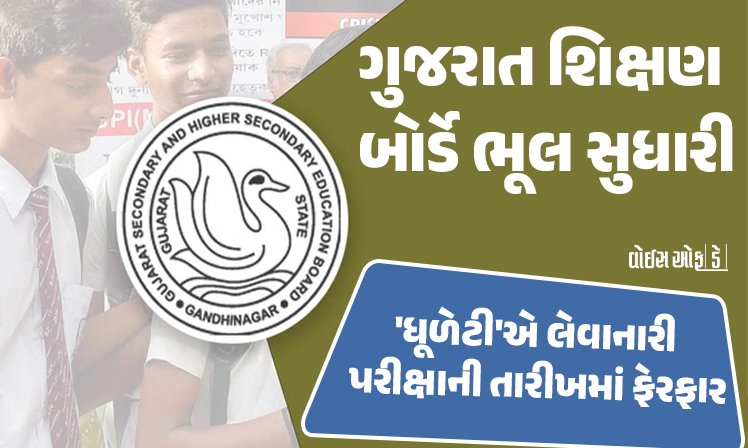 ગુજરાત માધ્યમિક અને ઉચ્ચતર માધ્યમિક શિક્ષણ બોર્ડ દ્વારા ધોરણ 10 અને ધોરણ 12 ની પરીક્ષાના ટાઈમ ટેબલમાં ધુળેટીના દિવસે પરીક્ષા ગોઠવાઈ હતી જો કે આ બાબતે બોર્ડને ધ્યાને આવતાં પરીક્ષાની તારીખમાં ફેરફાર કરવામાં આવ્યો છે અને તે અંગેનું સર્ક્યુલર શિક્ષણ બોર્ડએ બહાર પાડ્યું છે.