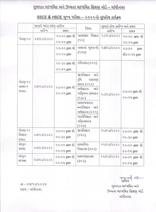 ફેબ્રુઆરી માર્ચ 2026 માં લેવાનારી મુખ્ય પરીક્ષા નો કાર્યક્રમ બોર્ડની વેબસાઈટ પર 8 નવેમ્બર 2025 ના રોજ જાહેર કરવામાં આવ્યો રાજ્ય સરકાર દ્વારા વર્ષ 2026ની જાહેર રજાઓ 27 નવેમ્બર ના રોજ જાહેર કરાઈ હોવાથી તેમાં ધુળેટીની રજા 4 માર્ચના રોજ જાહેર થયેલ છે. તે પરીક્ષાના ટાઈમ ટેબલ માં ફેરફાર કરવામાં આવ્યો છે. ચાર માર્ચના રોજ જે પરીક્ષા લેવાની હતી તે જેમાં ધોરણ 10 નું સામાજિક વિજ્ઞાનનું પેપર હવે 18 માર્ચ અને ધોરણ 12 નું એકાઉન્ટ નું પેપર 17 માર્ચ જ્યારે ધોરણ 12 સાયન્સમાં જીવ વિજ્ઞાનનું પેપર 16 માર્ચના રોજ લેવામાં આવશે.