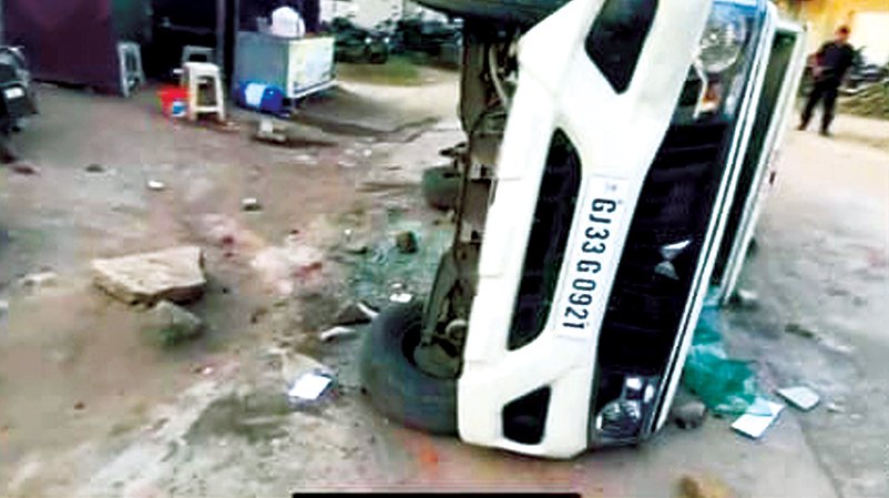 પોલીસની મોટી કુમક એકઠા થયેલા ખેડૂતો, ગ્રામજનો તરફ ધસી આવતા મામલો બિચક્યો હતો. શરૂઆતમાં પોલીસને પીછેહઠ કરાવવા હો-હા, દેકારો કર્યો હતો. પોલીસનો મોટો કાફલો આગળ ધપી રહ્યો હોવાથી વિફરેલા કેટલાક ઈસમોએ છત પરથી અને નીચે રસ્તા પરથી પોલીસ કાફલા સામે પથ્થરોના ઘા કરતાં પોલીસ જીવ બચાવવા પાછી વળી ગઈ હતી. ભારેલા અગ્નિ જેવી સ્થિતિ બની હતી. કોઈ ઈસમો તો રસ્તા પર ધોકા કે આવા મોટા દંડા જેવા સાધનો લઈને ઉતરી આવ્યા હતા. ઉશ્કેરાયેલા કેટલાક શખસોએ પોલીસની વાન (બોલેરો) જી.જે.33-જી.0921ને ઉંધી વાળી દીધી હતી. પથ્થરોના ઘા ઝીંકી તોડફોડ કરી હતી.