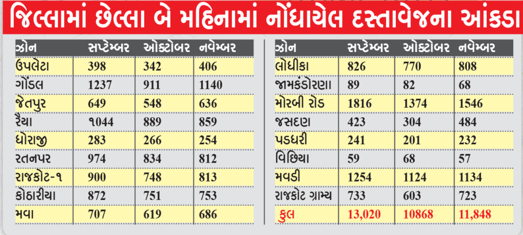 નવેમ્બર માસમાં રાજકોટ જિલ્લામાં સૌથી વધુ દસ્તાવેજની નોંધણી મોરબી રોડ સબ રજિસ્ટ્રાર કચેરીમાં 1546 દસ્તાવેજ, મવડીમાં 1134 અને ગોંડલ સબ રજિસ્ટ્રાર કચેરીમાં 1140 દસ્તાવેજની નોંધણી થઇ હતી. ઉલ્લેખનીય છે કે, ચાલુ વર્ષમાં દિવાળી બાદ ખેડૂતોના ખરીફ પાકને કમોસમી વરસાદથી નુકશાન થતા રિયલ એસ્ટેટક્ષેત્રે રોકાણનો પ્રવાહ ઘટ્યો હોય તેવી સ્થિતિ છે. જો કે, તેમ છતાં ગત માસની તુલનાએ નવેમ્બર માસમાં દસ્તાવેજ નોંધણીનું પ્રમાણ વધ્યું છે. જિલ્લામાં નવેમ્બર માસમાં સૌથી ઓછા દસ્તાવેજ વિછિયામાં 57 અને જામકંડોરણામાં માત્ર 68 દસ્તાવેજની નોંધણી થઇ હતી.