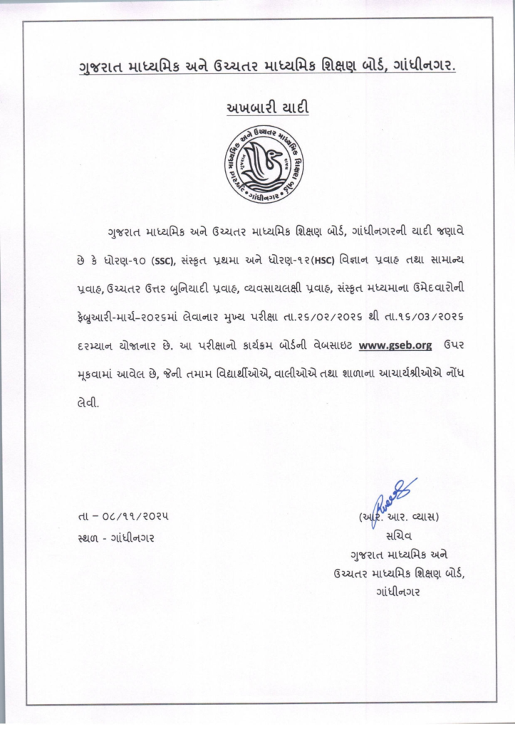 ગુજરાત માધ્યમિક અને ઉચ્ચતર માધ્યમિક શિક્ષણ બોર્ડ ગાંધીનગર દ્વારા જણાવવામાં આવ્યું છે કે ધોરણ-10 (SSC), સંસ્કૃત પ્રથમ અને ધોરણ-12(HSC) વિજ્ઞાન પ્રવાહ તથા સામાન્ય પ્રવાહ, ઉચ્ચતર ઉત્તર બુનિયાદી પ્રવાહ, વ્યવસાયલક્ષી પ્રવાહ, સંસ્કૃત મધ્યમાના વિદ્યાર્થીઓની ફેબ્રુઆરી-માર્ચ-2026માં મુખ્ય પરીક્ષા તા.26/02/2026 થી તા.16/03/2026 સુધી લેવામાં આવશે.