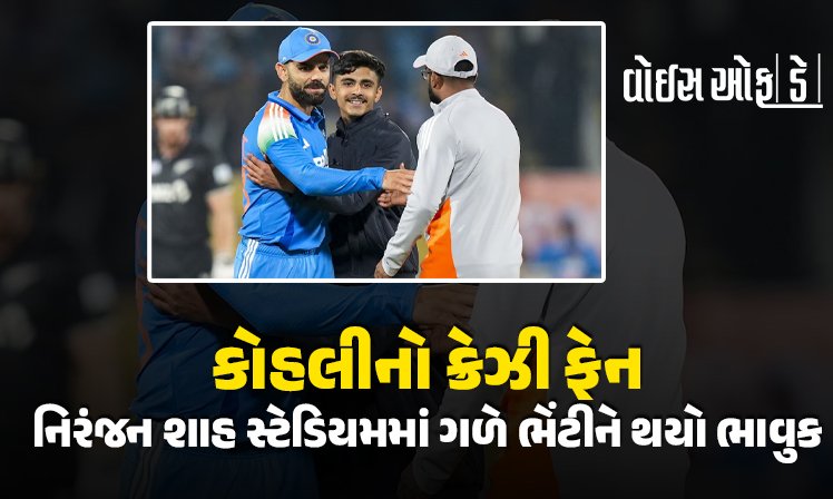 ભારત અને ન્યુઝીલેન્ડ વચ્ચેની ODI શ્રેણીની બીજી મેચ, જે બુધવાર, 14 જાન્યુઆરીના રોજ રાજકોટમાં રમાઈ હતી, તેમાં એક એવી ક્ષણ જોવા મળી જેણે લાખો ચાહકોના દિલ જીતી લીધા. નિરંજન શાહ સ્ટેડિયમમાં રમાયેલી મેચ દરમિયાન, જ્યારે ન્યુઝીલેન્ડ બેટિંગ કરી રહ્યું હતું, ત્યારે વિરાટ કોહલીનો એક ચાહક સુરક્ષા ઘેરો તોડીને મેદાનમાં પ્રવેશ્યો. ચાહક કોહલી પાસે પહોંચતાની સાથે જ, તેને દૂર ધક્કો મારવાને બદલે, કોહલીએ ગળે લગાવ્યો