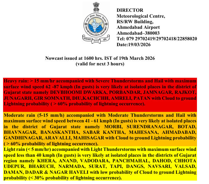 હવામાન વિભાગના નોકકાસ્ટ મુજબ, આજે (19 માર્ચ) દેવભૂમિ દ્વારકા, પોરબંદર, જામનગર, રાજકોટ, જૂનાગઢ, ગીર-સોમનાથ, દીવ, કચ્છ, અમરેલી અને પાટણ જિલ્લાઓમાં પવનની ઝડપ 62થી 87 કિ.મી. પ્રતિ કલાક રહેશે અને કમોસમી વરસાદને કારણે રેડ એલર્ટ જાહેર કરાયું છે.