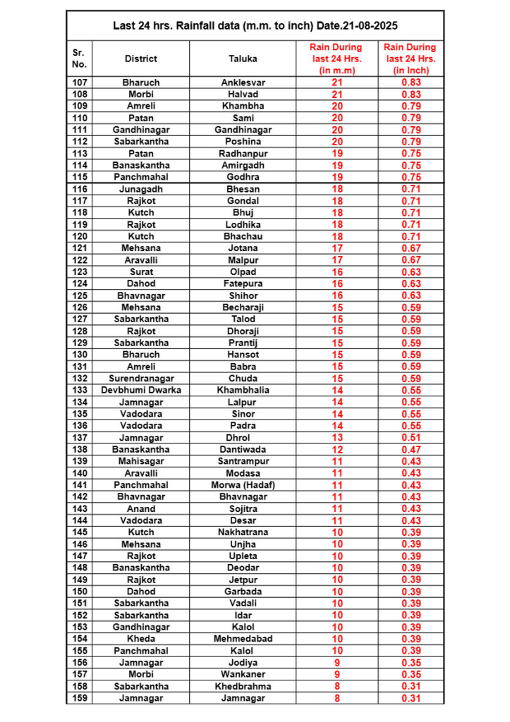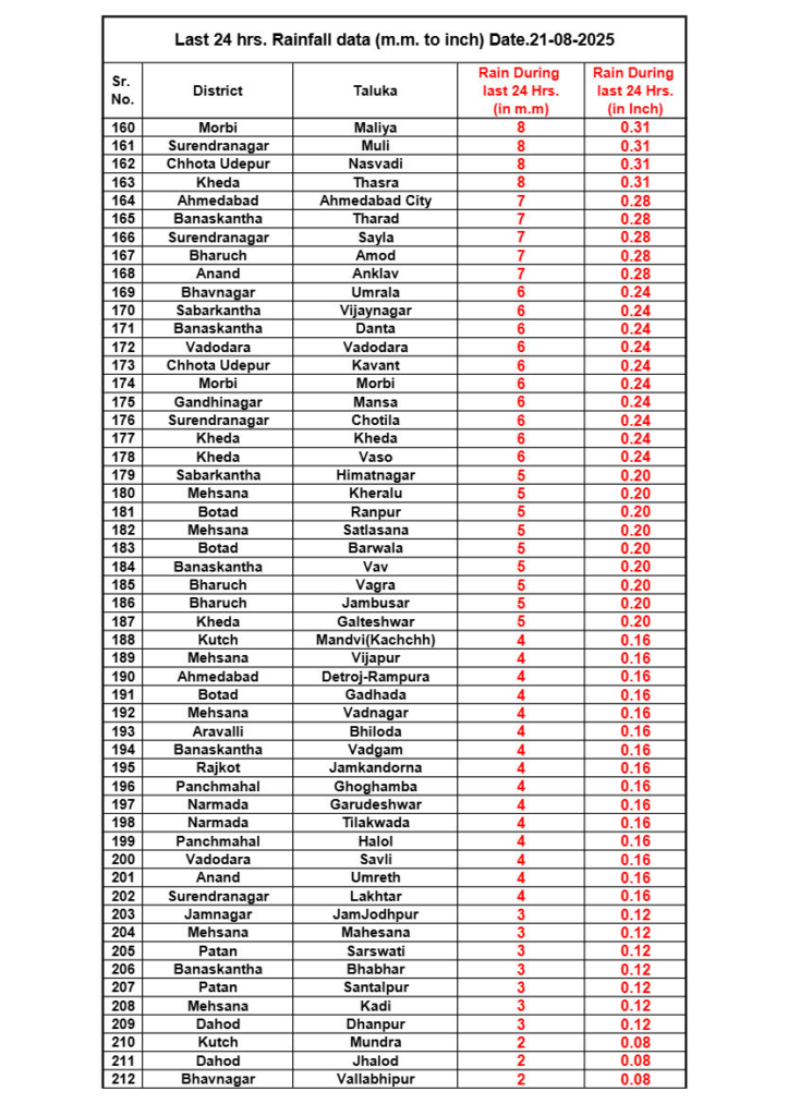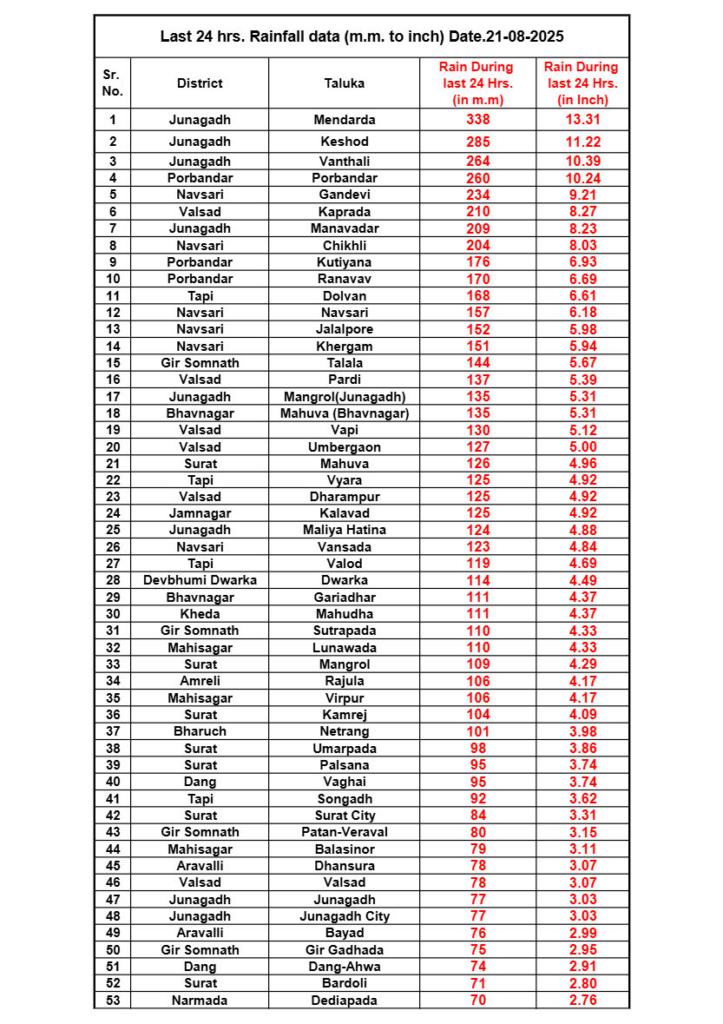 રાજ્યમાં છેલ્લા 24 કલાકમાં 226 તાલુકામાં વરસાદ ખાબક્યો છે. જેમાં સૌથી વધુ જૂનાગઢના મેંદરડામાં 13.31 ઈંચ નોંધાયો છે. જ્યારે કેશોદમાં 11.22 ઈંચ, વંથલીમાં 10.29 ઈંચ, પોરબંદરમાં 10.24 ઈંચ, ગણદેવીમાં 9.21 ઈંચ, માણાવદરમાં 8.23 ઈંચ, ચિખલીમાં 7.83 ઈંચ, કપરાડામાં 7.83 ઈંચ, કુતિયાણામાં 6.93 ઈંચ, રાણાવાવમાં 6.69 ઈંચ, ડોલવણમાં 6.61 ઈંચ, નવસારીમાં 5.98 ઈંચ, જલાલપોરમાં 5.79 ઈંચ, વરસાદ નોંધાયો હતો. જ્યારે 103 તાલુકામાં 1 ઈંચ સુધીનો વરસાદ નોંધાયો હતો.