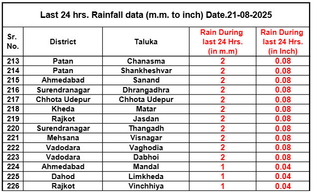 રાજ્યમાં છેલ્લા 24 કલાકમાં 226 તાલુકામાં વરસાદ