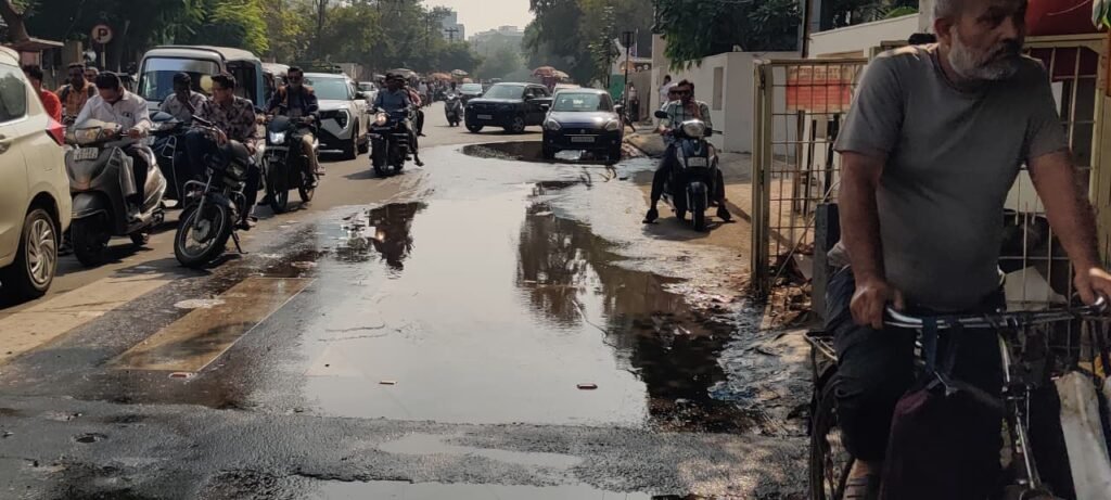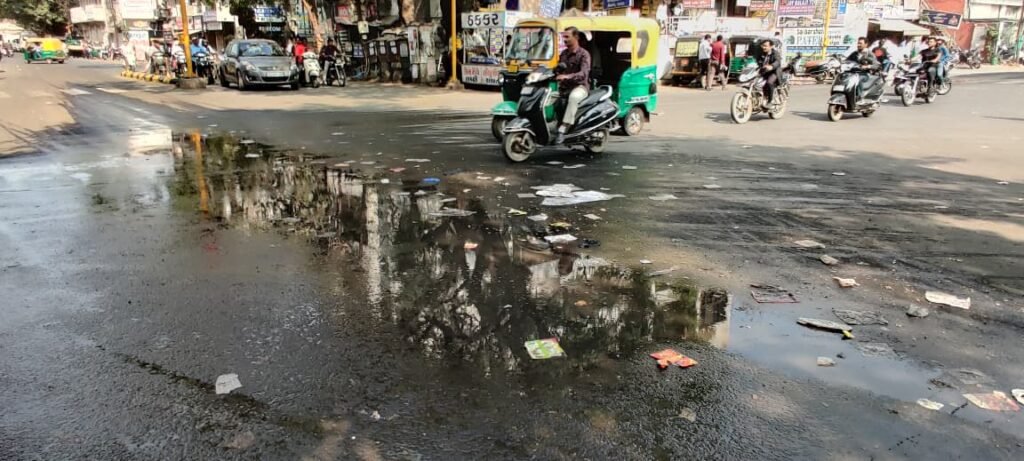જ્યારે બીજી તસવીર લીમડા ચોકની છે જ્યાંથી મોદી પસાર થવાના ન હોવાને કારણે તેની હાલત કેટલી ખરાબ છે તેના પરથી કલ્પના કરવી પડે. અહીં ગટરની લાઈન તૂટી ગઈ હોવાથી દૂર્ગંધયુક્ત પાણી રસ્તા ઉપર વહી રહ્યું છે અને સિગ્નલ ઉપર વાહનચાલકોએ ગંદા પાણીમાં પગ રાખીને ઉભું રહેવું પડે છે આમ છતાં મહાપાલિકાનું રેઢિયાળ તંત્ર આ મુશ્કેલીથી અજાણ છે !