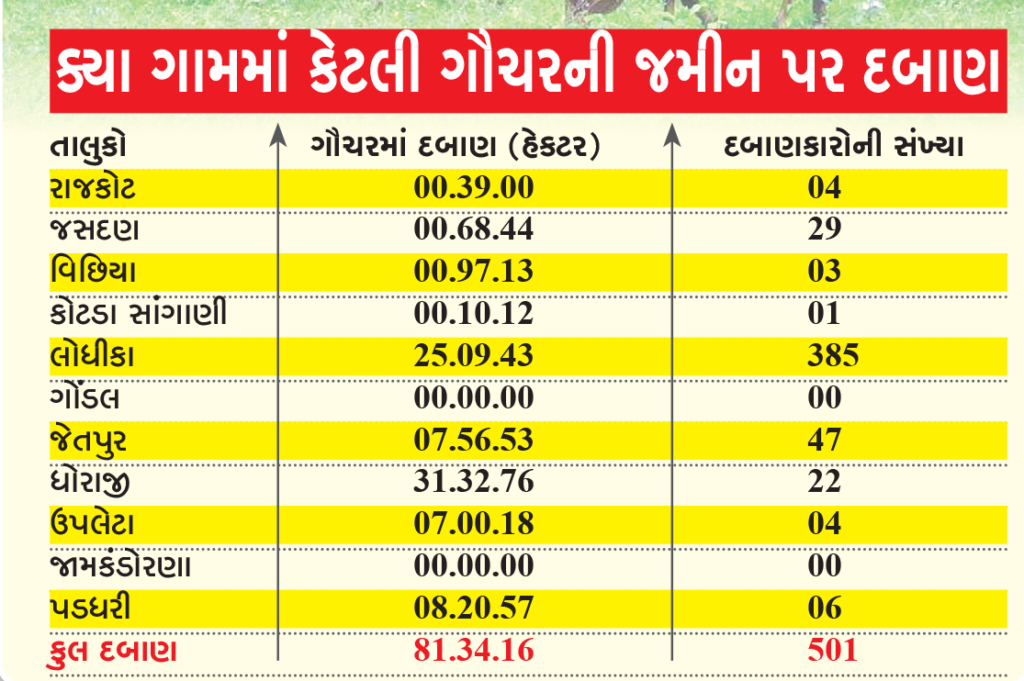 રાજકોટ જિલ્લા પંચાયતના સત્તાવાર આંકડા મુજબ રાજકોટ જિલ્લાના 11 તાલુકામાં આવેલ કુલ 593 ગામોમાં કુલ 54411.15 હેકટર ગૌચરની જમીન આવેલી છે. જેમાં છેલ્લા આંકડા મુજબ રાજકોટ જિલ્લાના ગોંડલ અને જામકંડોરણા તાલુકાને બાદ કરતા તમામ તાલુકાઓમાં ગૌચરની જમીન ઉપર દબાણ કરી લેવામાં આવ્યા છે. દબાણની સંખ્યાની દ્રષ્ટિએ રાજકોટના લોધીકા તાલુકામાં 385 માથાભારે તત્વોએ ગૌચરની જમીન પર કબ્જો કરી લઈ કુલ 25.09 હેકટર એટલે કે, સવાસો વિઘાથી વધુ જમીન ગૌવંશના હિસ્સાની હડપ કરી લીધી છે. એ જ રીતે ધોરાજી તાલુકામાં વિસ્તારની દ્રષ્ટિએ 140 વિઘાથી વધુ જમીન પર 47 દબાણકારોએ ગૌચરની ભૂમિ દબાવી લઈ ખેતી વિષયક ઉપયોગ કરી રહ્યા છે.
