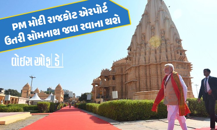 નવો જે કાર્યક્રમ સામે આવ્યો છે તે પ્રમાણે શનિવારે વડાપ્રધાન નરેન્દ્રભાઈ મોદી રાજકોટના હિરાસર એરપોર્ટ ઉપર આવી પહોંચશે. અહીંથી તેઓ હેલિકોપ્ટર મારફતે સોમનાથ જવા માટે રવાના થશે. સોમનાથ મંદિર ઉપર મોહમ્મદ ગઝનવીએ હુમલો કર્યો તેને 1000 વર્ષ પૂર્ણ થઈ રહ્યા હોય સોમનાથ ખાતે ખાસ કાર્યક્રમનું આયોજન કરવામાં આવ્યું છે. આ પ્રસંગને ધ્યાનમાં રાખી `અતૂટ આસ્થા કે 1000 વર્ષ’ની થીમ ઉપર સ્વાભિમાન પર્વનું આયોજન કરવામાં આવ્યું છે જે અંતર્ગત વિવિધ કાર્યક્રમો આયોજિત થયા હોય મોદી તેમાં ઉપસ્થિત રહેશે.