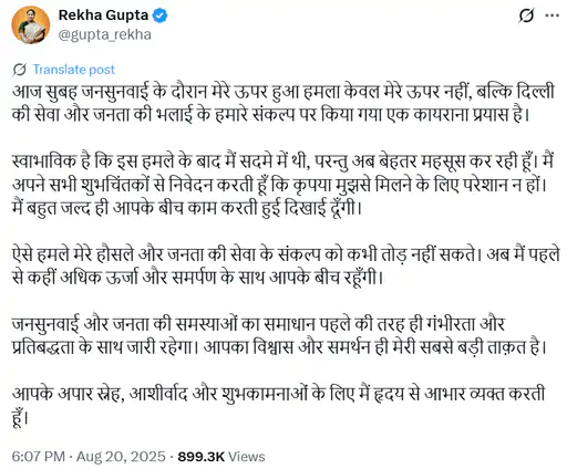 મુખ્યમંત્રી રેખા ગુપ્તા દર બુધવારે સામાન્ય લોકોની ફરિયાદો સાંભળવા માટે જાહેર સુનાવણી કરે છે. બુધવારે સવારે લગભગ 8.15 વાગ્યે, તે જનતાની સમસ્યાઓ સાંભળી રહી હતી. દરમિયાન, સવારે લગભગ 8.20 વાગ્યે, આરોપી રાજેશ મુખ્યમંત્રીની સામે પહોંચ્યો. આરોપીએ પહેલા મુખ્યમંત્રીને કેટલાક કાગળો સોંપ્યા. તેણે મુખ્યમંત્રી સાથે વાત કરવાનું શરૂ કર્યું.