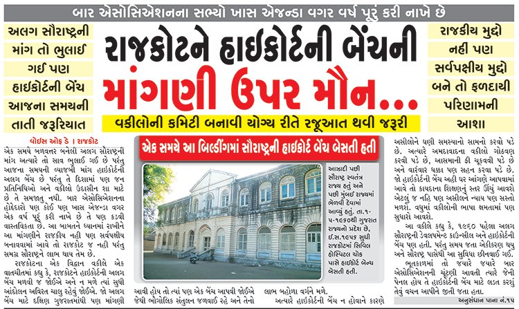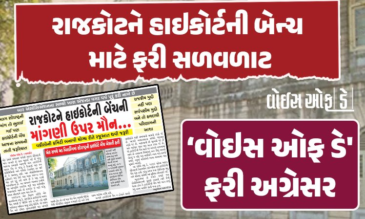 હંમેશા સત્ય, સચોટ સમાચાર પ્રસિદ્ધ કરવામાં માનતું ‘વોઈસ ઓફ ડે’ હાઈકોર્ટની બેન્ચ મળે તે માટે લડતની જરૂરિયાત હોવાનો અહેવાલ પ્રસિદ્ધ કર્યો હતો. આ અહેવાલમાં જણાવાયું હતું કે વકીલોની કમિટી બનાવી યોગ્ય રજૂઆત કરવી જરૂરી છે. આ અહેવાલ ૪ ઓગસ્ટે પ્રસિદ્ધ થયા બાદ પાંચ ઓગસ્ટે જ વકીલો એક્શનમાં આવ્યા હતા અને કમિટીની રચના પણ કરી હતી.