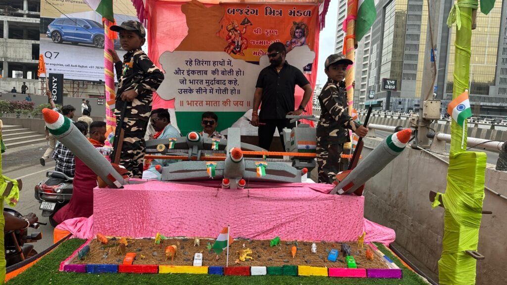 રાજકોટના રાજમાર્ગો કાનુડાના રંગે રંગાયા: વી.હિ.પ. દ્વારા આયોજિત જન્માષ્ટમીની શોભાયાત્રામાં ઓપરેશન સિંદૂર થીમ પર મુખ્ય રથ