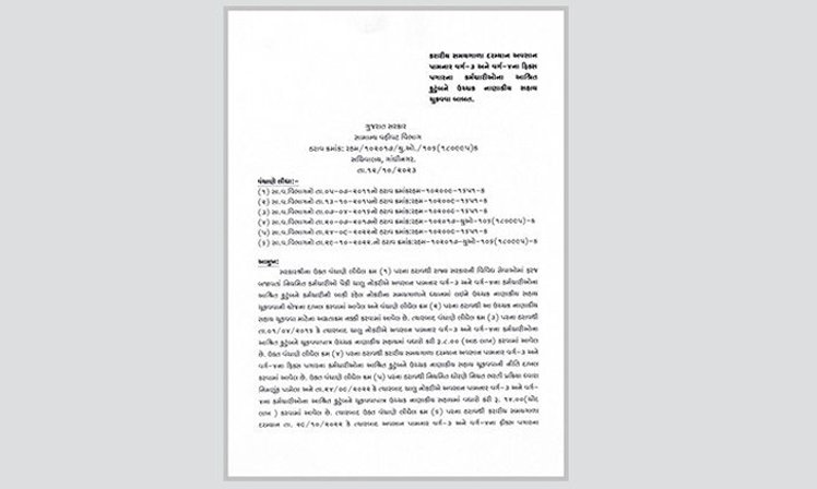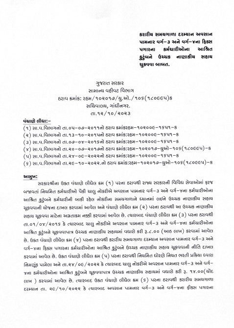 ગુજરાત સરકારના સામાન્ય વહીવટ વિભાગના સંયુક્ત સચિવ એચ.કે ઠાકર દ્વારા જાહેર કરવામાં આવેલા પરિપત્રમાં જણાવવામાં આવ્યું છે કે, રાજ્ય સરકારની વિવિધ કચેરીઓ ખાતેની નિયમિત જગ્યા ઉપર ફિક્સ પગારની નીતિ અન્વયે કરારીય ધોરણે નિમણૂક પામેલા વર્ગ-3 અને વર્ગ 4ના કર્મચારીઓની ફિક્સ પગારની સેવા દરમિયાન તા-12/10/2023 કે ત્યારબાદ થયેલા અવસાનના કિસ્સામાં રૂ.14 લાખ (ચૌદ લાખની) ઉચ્ચક નાણાકીય સહાય ચૂકવવાની રહેશે.