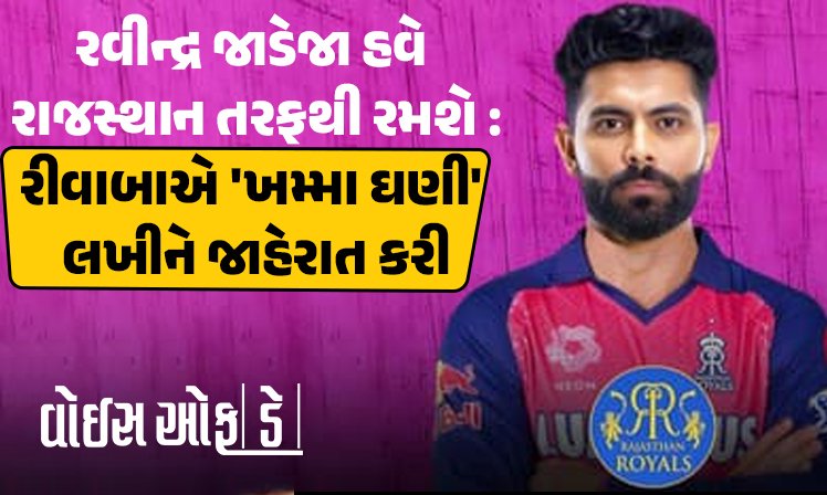 IPL 2026 પહેલા, ચેન્નાઈ સુપર કિંગ્સ અને રાજસ્થાન રોયલ્સ વચ્ચે એક મોટો સોદો થયો છે. CSK ના સ્ટાર ખેલાડી રવિન્દ્ર જાડેજાને CSK માંથી રાજસ્થાન રોયલ્સ માં ટ્રાન્સફર કરવામાં આવ્યો છે. જાડેજા હવે આગામી સીઝનમાં ₹14 કરોડ (આશરે $1.4 બિલિયન) ની મોટી રકમમાં રાજસ્થાન રોયલ્સ માટે રમશે. રીવાબાએ ‘ખમ્મા ઘણી’ લખીને જાહેરાત કરી છે.