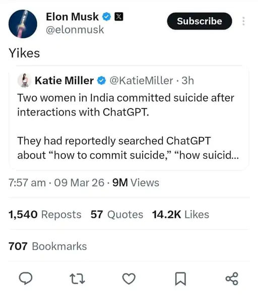 એલન મસ્કે x પ્લેટફોર્મ પર પર આત્મહત્યાની આ ઘટના અંગે Yikes શબ્દનો ઉલ્લેખ કર્યો છે અને ચિંતા વ્યક્ત કરી હતી . એક યુઝરએ X પર સુરતની બે યુવતીએ ChatGPT ની મદદથી કરેલ આપઘાતની વિગત શેર કરી હતી. જેની નોંધ વિશ્વના સૌથી મોટા ઉદ્યોગકાર અને X ના માલિક એલન મસ્કે આ ઘટનાને ગંભીર ગણાવતી ટ્વિટ કરી છે.