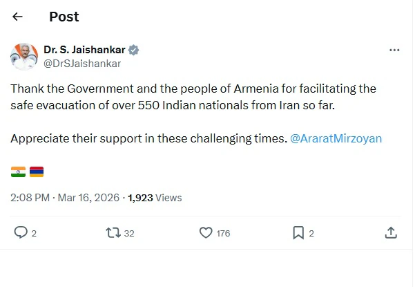 જયશંકરે ઈરાનથી 550 ભારતીયોને બહાર કાઢવામાં મદદ કરવા બદલ આર્મેનિયાનો આભાર માન્યો