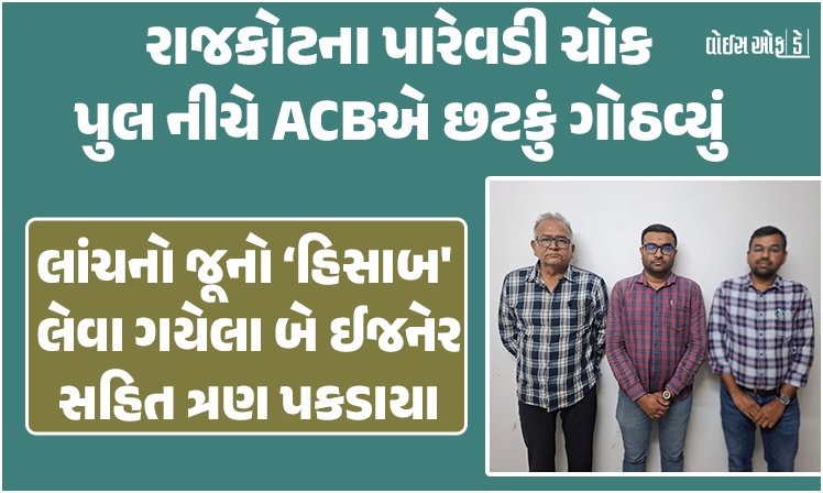 આ અંગે ACBના મદદનીશ નિયામક કે.એચ.ગોહિલના માર્ગદર્શન હેઠળ ટીમે પારેવડી ચોક પુલનીચે બજરંગ ટી-સ્ટોલ પાસેથી 50 હજારની લાંચ લેતા માર્ગ અને મકાન કચેરીના યાંત્રિક પેટા વિભાગના કાર્યપાલક ઈજનેર (વર્ગ-1) પિયુષ બાબુભાઈ બાંભરોલિયા, નાયબ કાર્યપાલક ઈજનેર (વર્ગ-2) નિરવ પ્રવિણચંદ્ર રાઠોડ તેમજ વચેટિયા સુધીર નવિનચંદ્ર બાવીશીને રંગે હાથ પકડ્યા હતા.