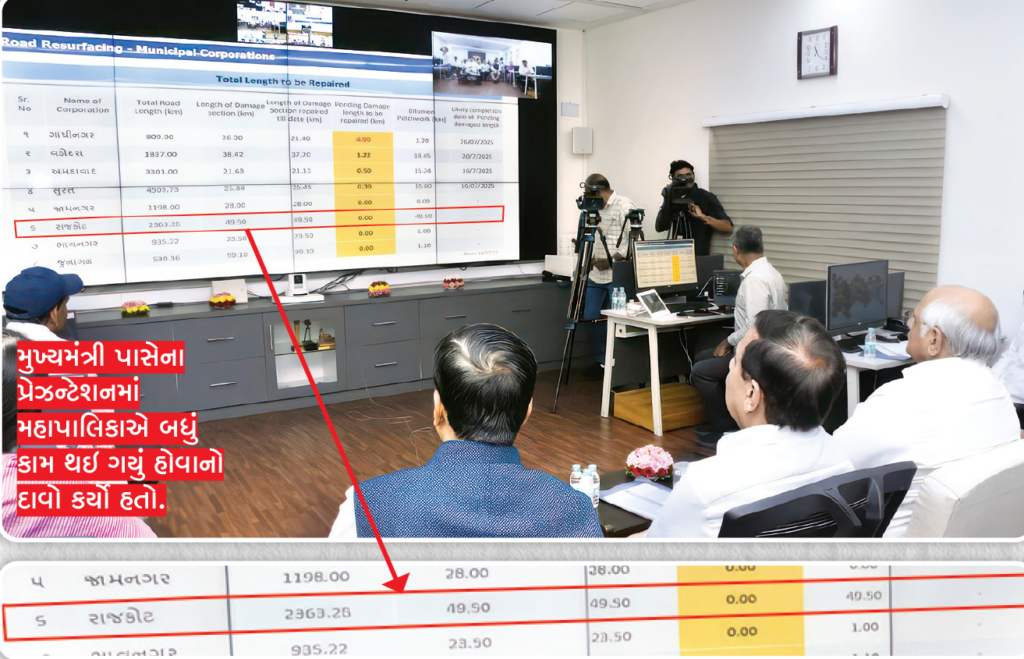 મંગળવારે મુખ્યમંત્રી ભૂપેન્દ્રભાઈ પટેલે વીડિયો કોન્ફરન્સના માધ્યમથી વરસાદને કારણે રોડ-રસ્તાને કેટલું નુકસાન થયું અને કેટલું રિપેરિંગ થયું જ્યારે બાકી રહેલું રિપેરિંગ ક્યાં સુધીમાં થશે તે અંગે અધિકારીઓને પૂછાણ કર્યું હતું. આના જવાબમાં રાજકોટ મહાપાલિકા દ્વારા લેખિતમાં એવું જણાવાયું હતું કે 2363.25 કિલોમીટરના રસ્તામાંથી 49.50 કિલોમીટરના રસ્તામાં નુકસાન થયું હતું જે પૈકી 49.50 કિલોમીટરનો રસ્તો એકદમ ઠીક કરી દેવામાં આવ્યો હોવાથી અત્યારે કોઈ જ પ્રકારની રસ્તાની કામગીરી પેન્ડીંગ નથી !